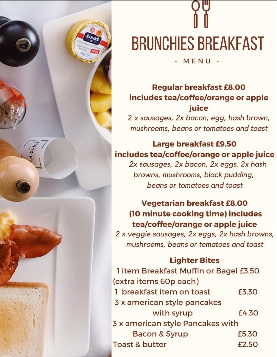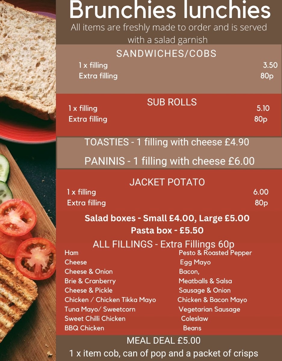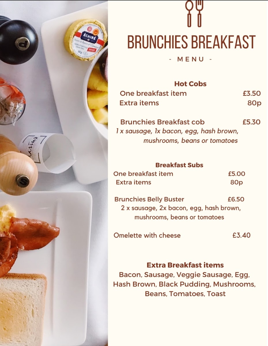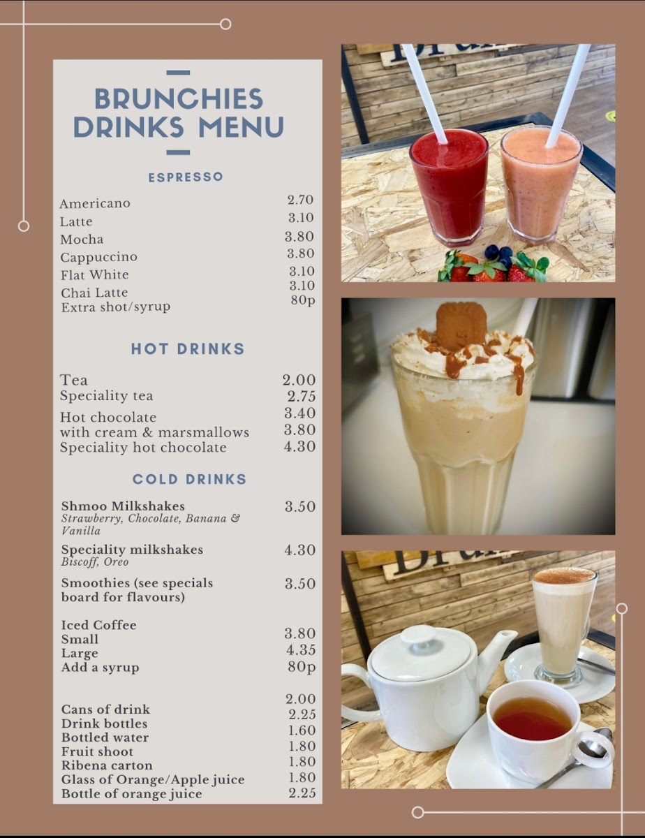 The Brunchies Lunchies menu is appealing, with vibrant lunch items available from £3.50, perfect for a midday pick-me-up. Accompany your meal with a selection from their drinks menu, all at £2.00.